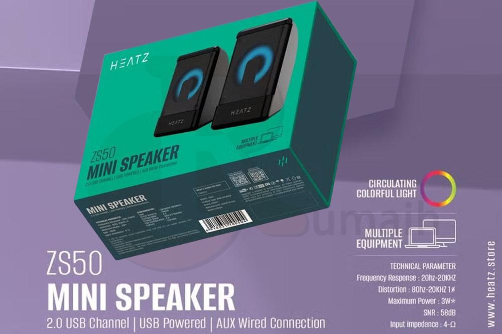 HEATZ ZS50 USB SPEAKER FOR COMPUTER PC & LAPTOPالمميزات- سماعات خارجية للكمبيوتر المكتبي و الاب توب .- تعمل على منفذ يو اس بي و AUX .- قوة السماعة 3Wx2 .- عدد السماعات 2 .- طول الكابل 120 سم .- إضائة ملونة متغيرة .- لون اسود .